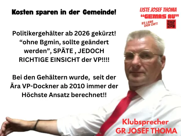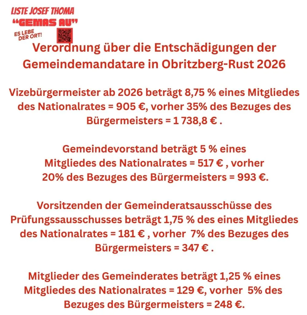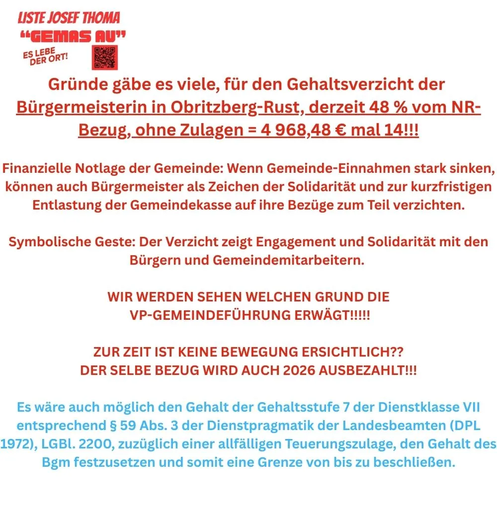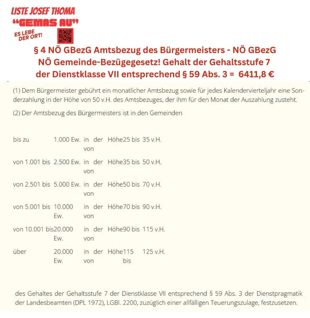 Unser Antrag bereits im September 25 eingebracht, endlich auch bei uns Politiker einzusparen wurde umgesetzt. Nur muss man sich fragen, was im Ausschuss beschlossen wurde? Unsere Fraktion hat kein Stimmrecht. Das Gemeindeoberhaupt muss sich dem nicht anschließen, da diese 48% vom Nationalratsbezug erhält, es gäbe auch eine andere Möglichkeit der Bezahlung für Bürgermeister in NÖ, siehe Beilage. Alle anderen Mitglieder des Gemeinderates werden ab 2026 nicht mehr vom Gehalt der Bgmin berechnet, sondern vom Bezug des Nationalrates. Wieviel weniger dies ist, sehen sie in der Beilage.
